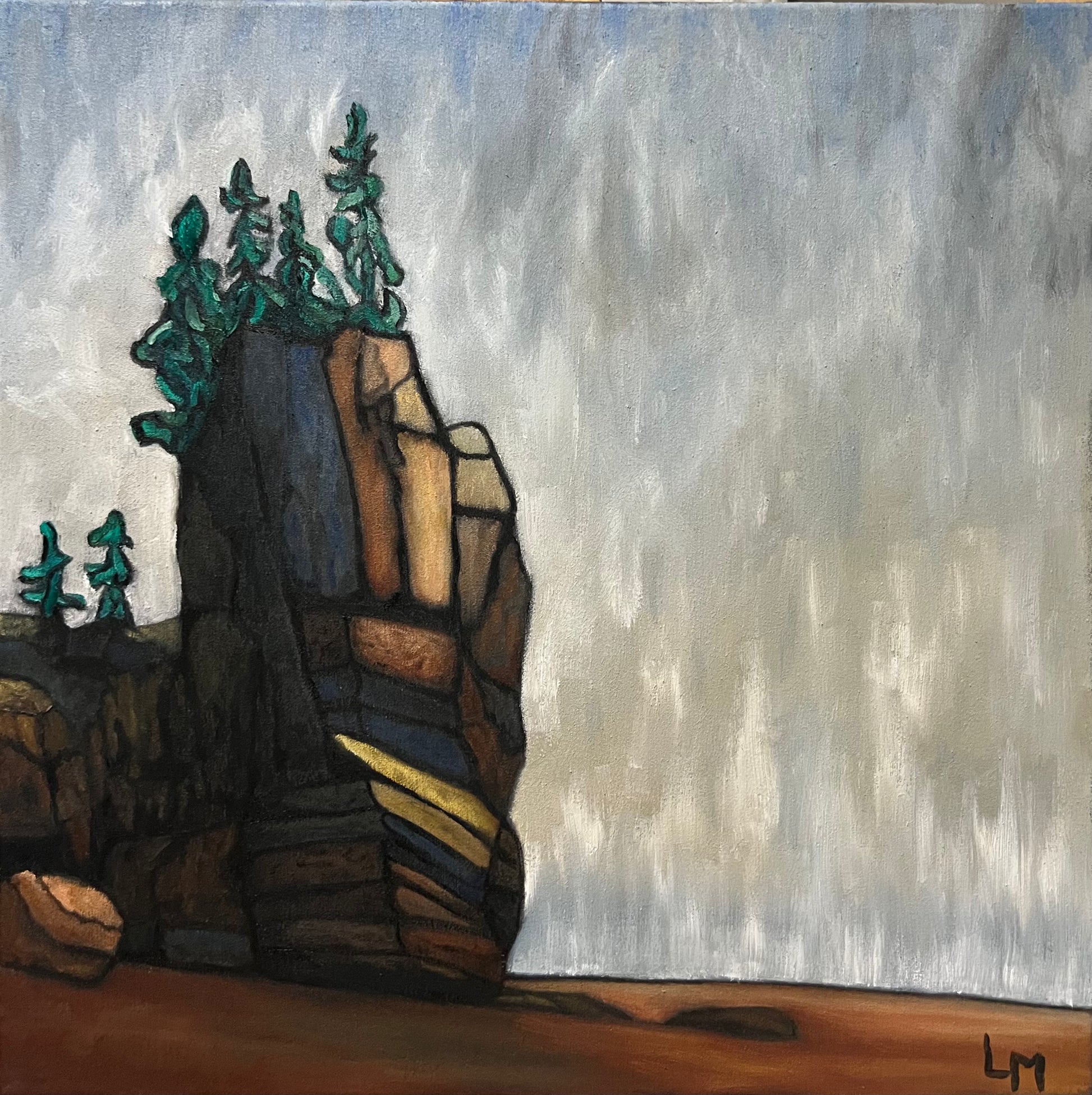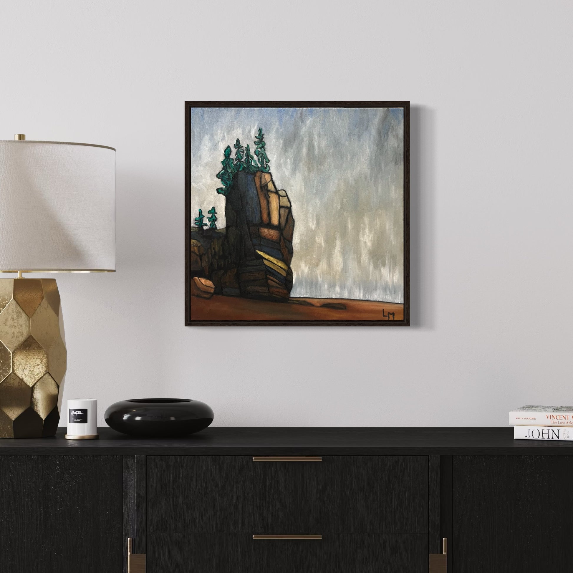 Rising from the Bay of Fundy’s dramatic tides, Hopewell Sentinel captures the enduring strength of New Brunswick’s iconic sea stacks. The rock face, fractured into bold geometric planes of earth and stone, stands in quiet defiance against the shifting sky. Windswept evergreens cling to the summit, symbols of resilience and time’s passage. With its blend of structure and atmosphere, this piece evokes both permanence and solitude—an eternal watchman at the edge of the sea.